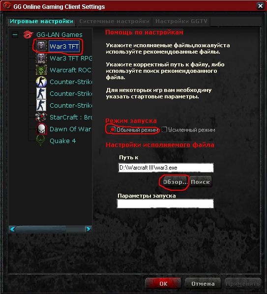 и лицезреем менюшку настроек. В списке слева выбираем War3 TFT, чуть правее и ниже кликаем на галочку Normal Mode и потом, посредством кнопки Browse, выставляем путь до файла war3.exe (но не "Frozen Throne.exe"), который лежит в каталоге игры.