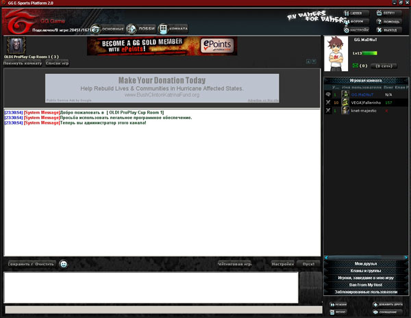 По центру окошко чата, справа - список находящихся на канале людей. Для того чтобы запустить игру, нажмите кнопку Start Game справа внизу.
