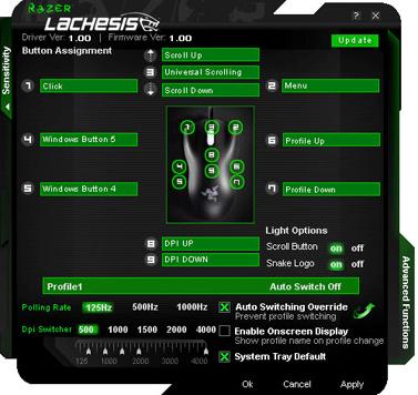 Программное обеспечение Lachesis позволяет производить очень большое число настроек. Можно создавать 5 профилей, в каждом из которых можно задать разрешение (от 125 до 4000 dpi с шагом 125 dpi), частоту опроса мыши (125, 500, 1000 Гц), чувствительность мыши (от 1 до 10), назначение кнопок (команды, макросы), а также включение/выключение подсветки