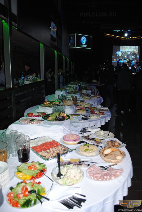 А вот для зрителей пришедших насладиться исключительно просмотром игр все было на высшем уровне. Отличные удобные диванчики, которых было довольно много. Бесплатная еда (салаты, мясные закуски, фрукты и многое другое), столы с которой заполняли на протяжении всего вечера и недостатка в ней небыло. Три больших экрана для просмотра матчей, на главном шло изображение с компьютера комментатора, дабы было понятно о чем идет речь, а на двух других была трансляция от первого лица игроков.